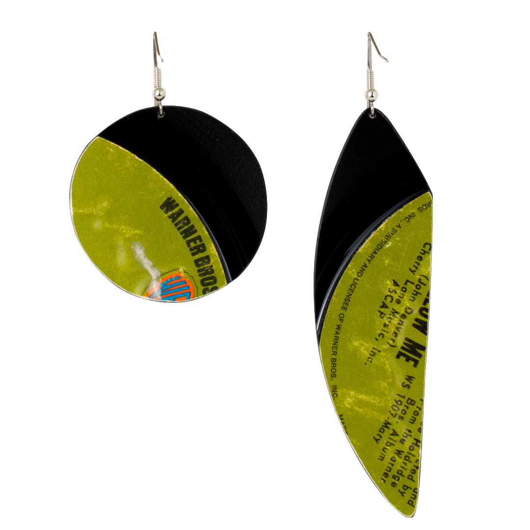 Each Extra Large Asymmetrical Classic Dangle is hand-cut and hand-filed from an authentic 45 rpm record featuring Mary Travers’s “I Guess He’d Rather Be in Colorado.” The asymmetrical silhouette adds movement and character while preserving the texture and history of the original vinyl. Lightweight yet visually striking, these earrings transform rescued music history into a wearable statement piece that feels both nostalgic and modern.