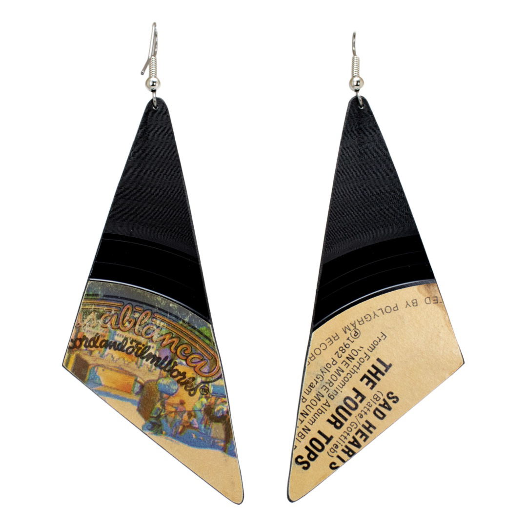 Each Large Scalene Triangle Classic Dangle is hand-cut and hand-filed from an authentic 45 rpm record featuring Four Tops’s “I Believe in You and Me.” The scalene triangle silhouette adds movement and character while preserving the texture and history of the original vinyl. Lightweight yet visually striking, these earrings transform rescued music history into a wearable statement piece that feels both nostalgic and modern.
