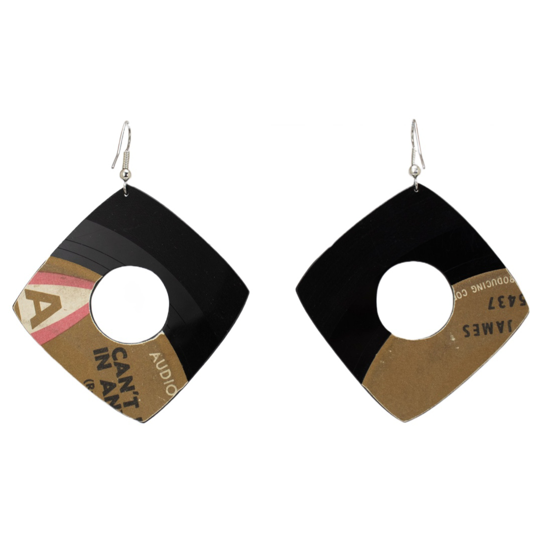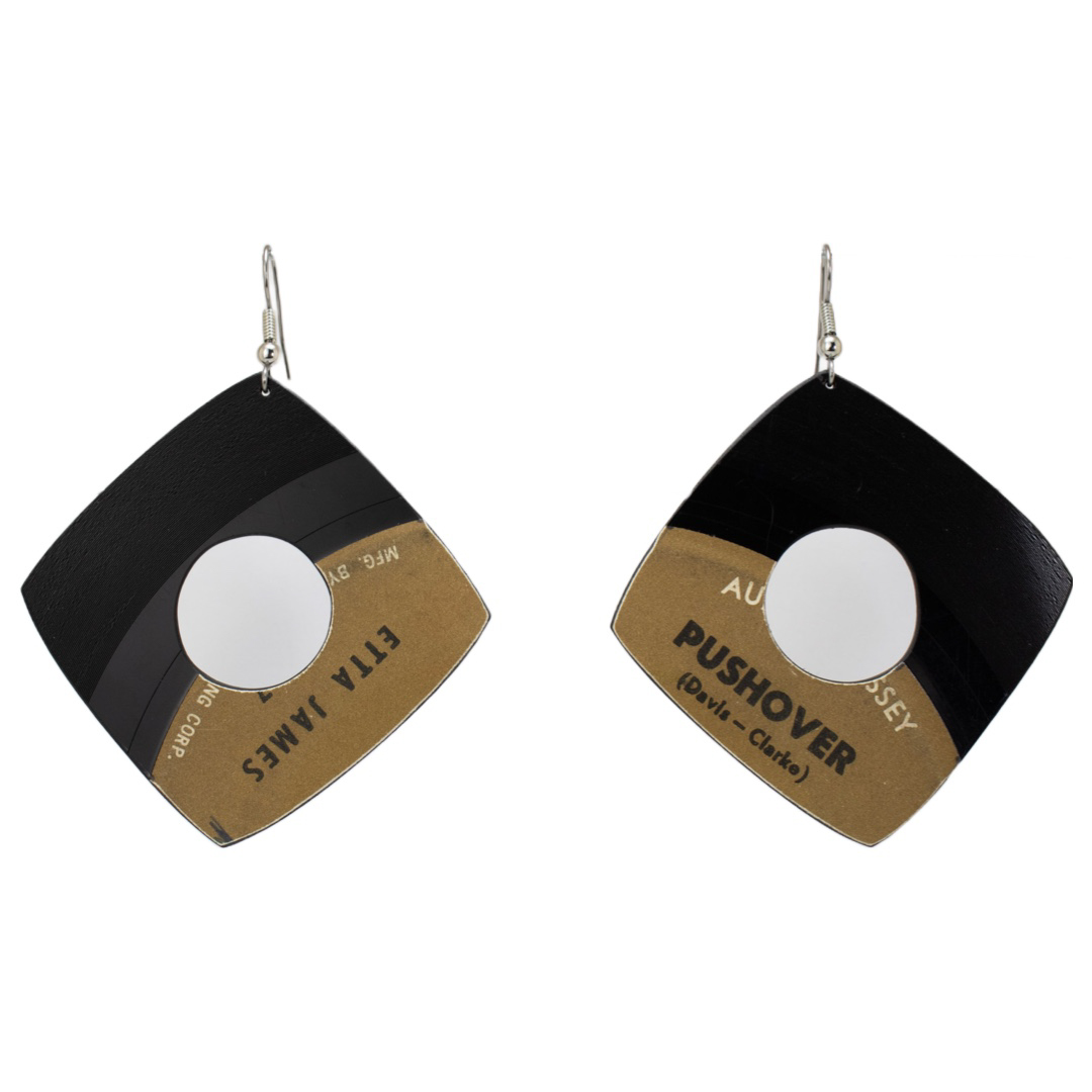 Each Large Square Center Hole Classic Dangle is hand-cut and hand-filed from an authentic 45 rpm record featuring Etta James’s “Pushover.” The square center hole silhouette adds movement and character while preserving the texture and history of the original vinyl. Lightweight yet visually striking, these earrings transform rescued music history into a wearable statement piece that feels both nostalgic and modern.