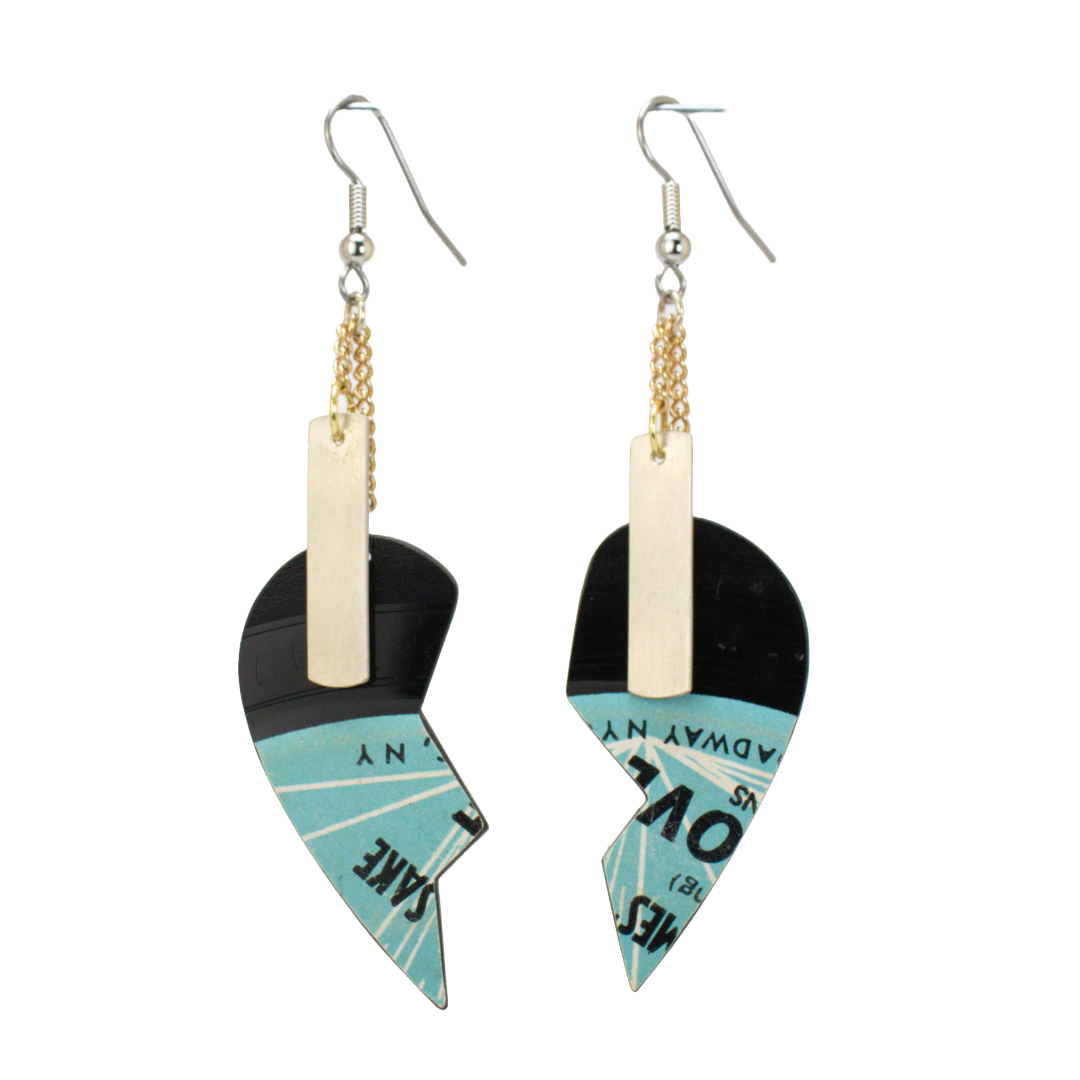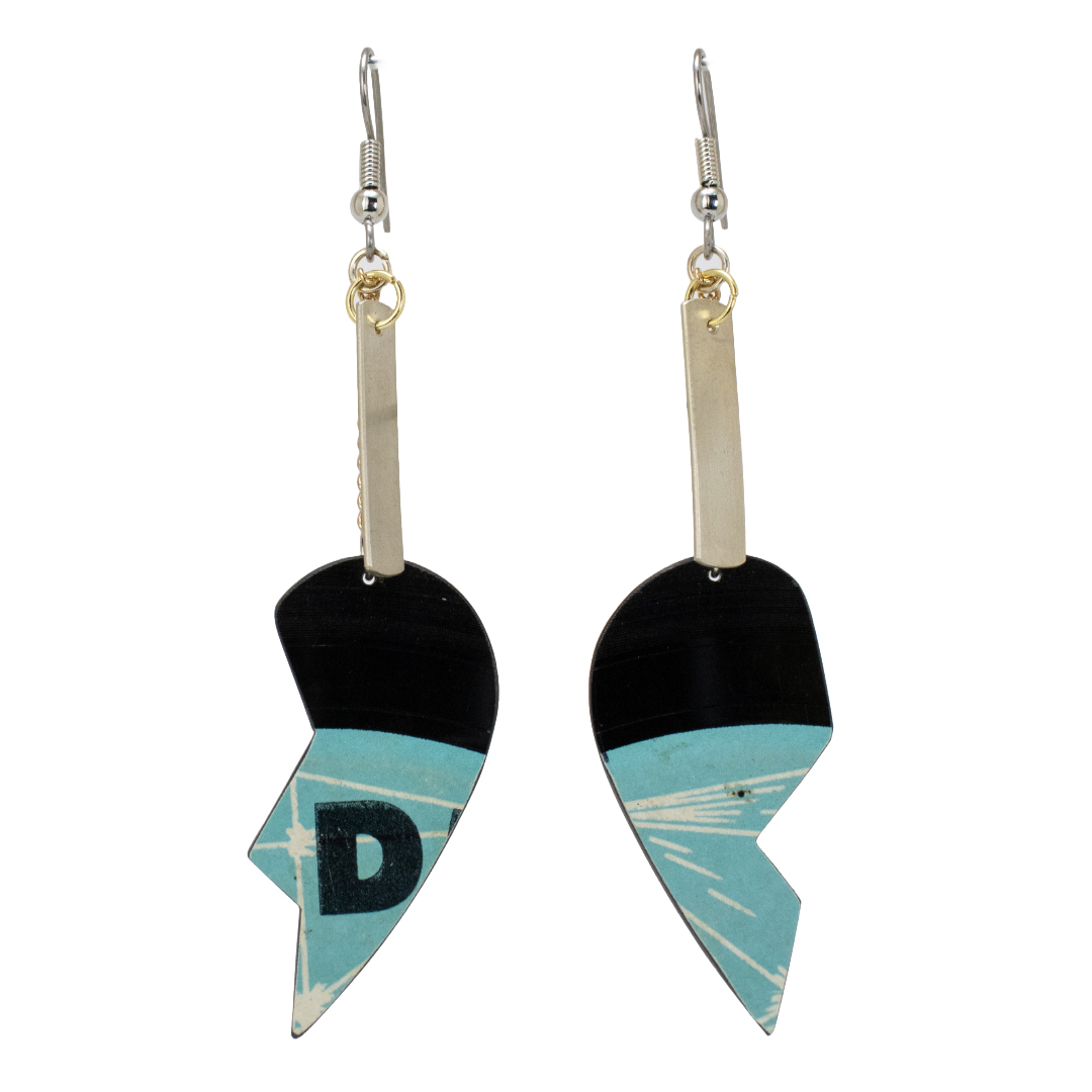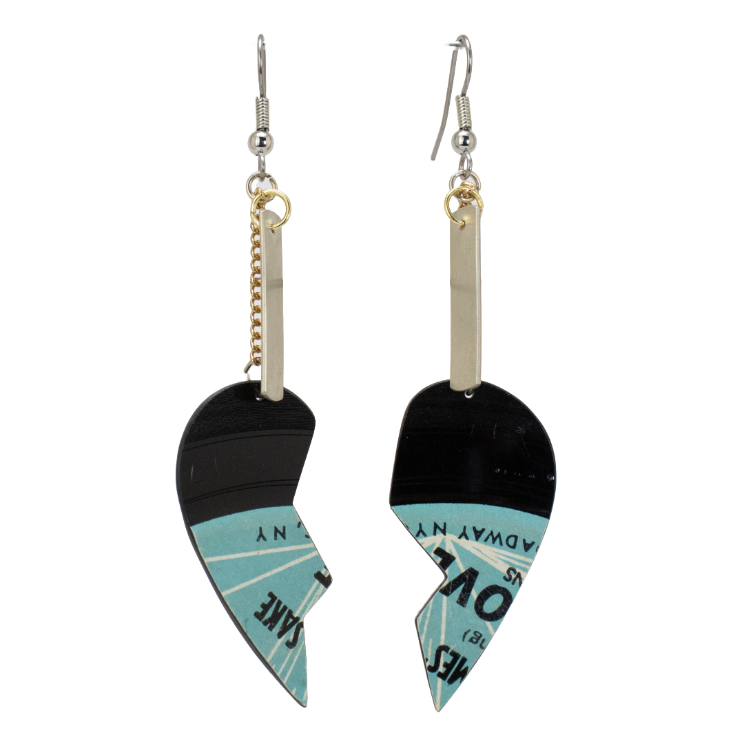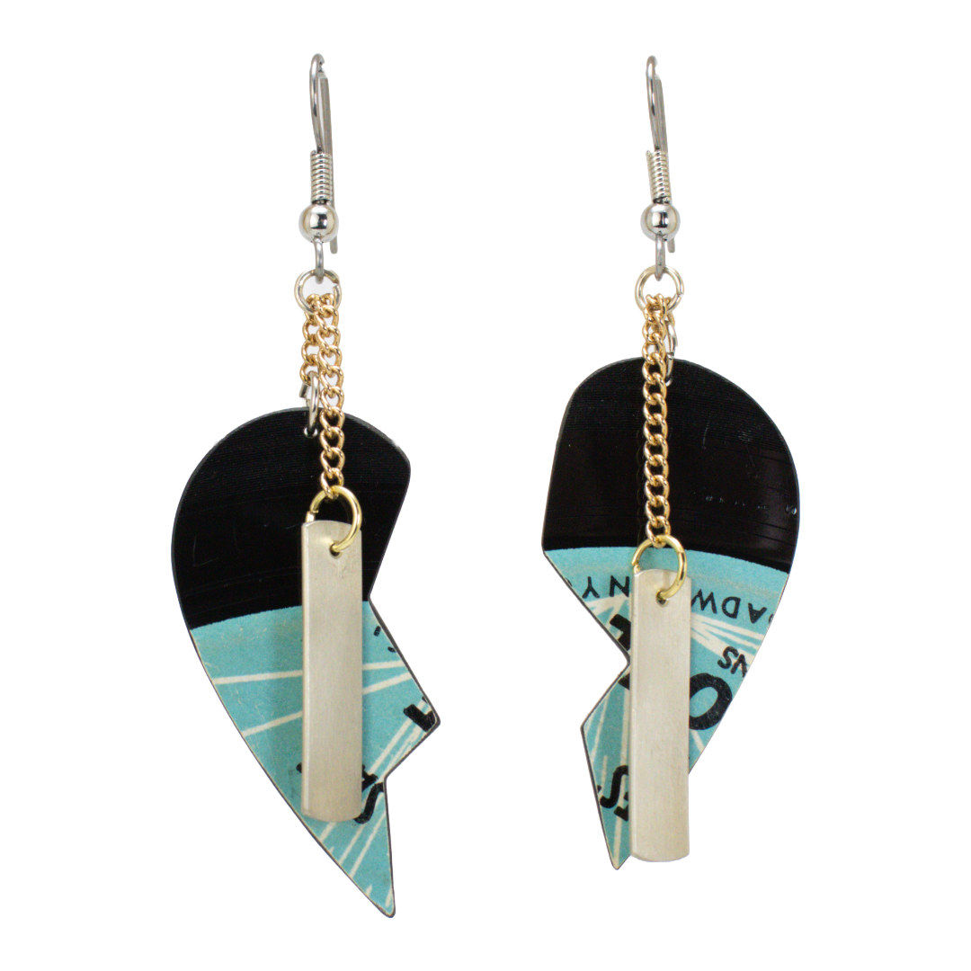 Each Medium Movable Broken Heart is hand-cut and hand-filed from an authentic aqua vinyl Ronnie Dove 45 on Diamond Records. The movable silhouette splits and shifts as you move — two halves of a broken heart finished with a base metal gold chain and nickel flat wire. The soft aqua color of the vinyl gives this piece a quiet, unexpected beauty that sets it apart from anything else in the collection.