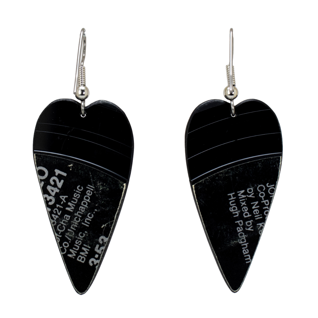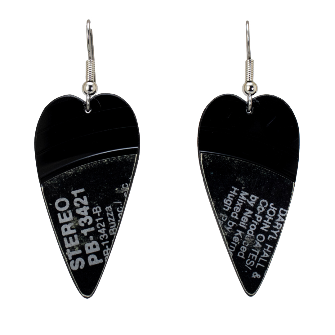 Each Medium Sleek Heart Classic Dangle is hand-cut and hand-filed from an authentic Daryl Hall & John Oates 45 on RCA Records. The sleek heart silhouette is slim and modern — a clean, elongated form that moves with you and catches light at every angle. Cut from the black and color vinyl of one of the most iconic duos in pop and soul history, these earrings carry the energy of an era that still sounds undeniable.