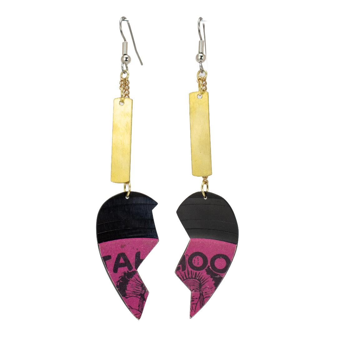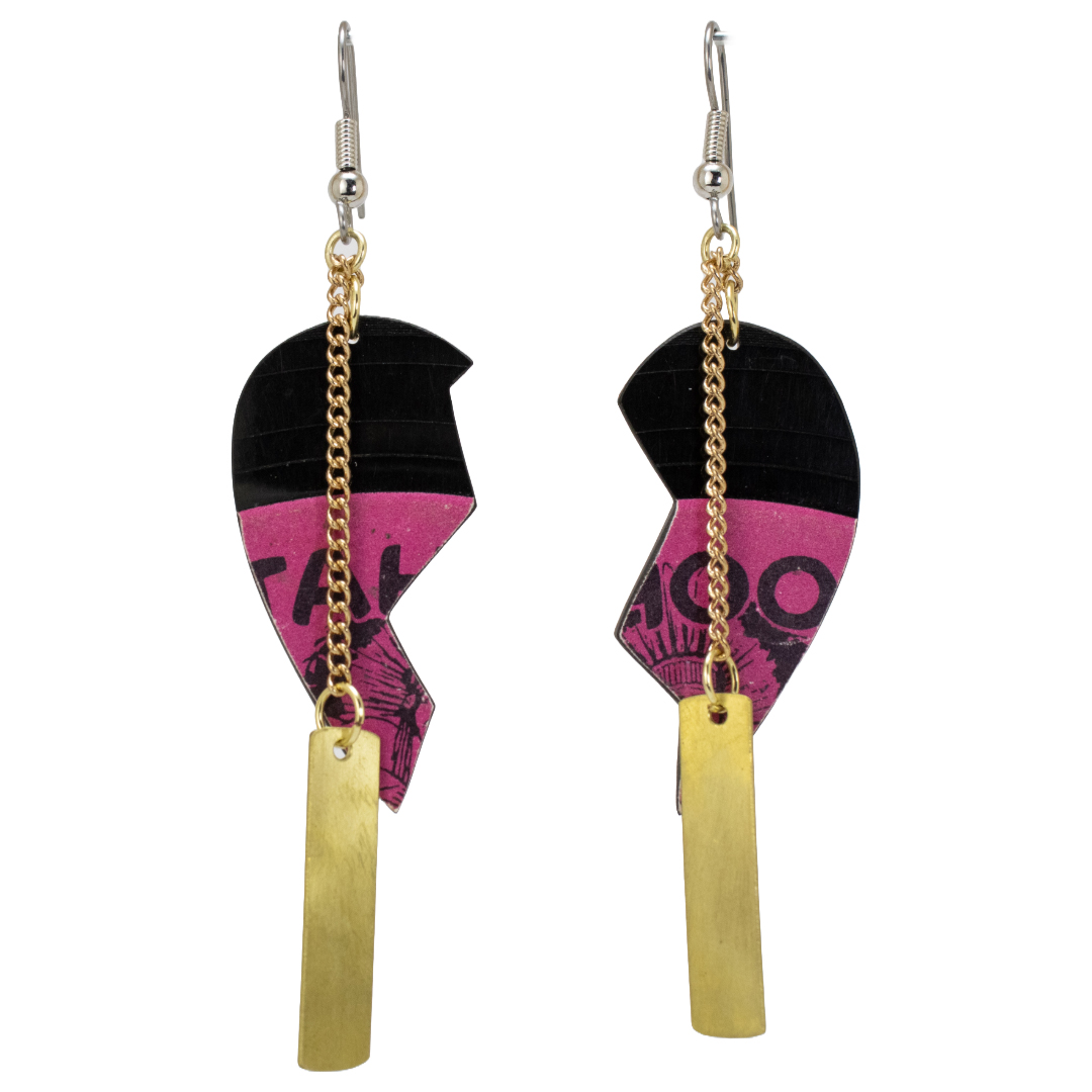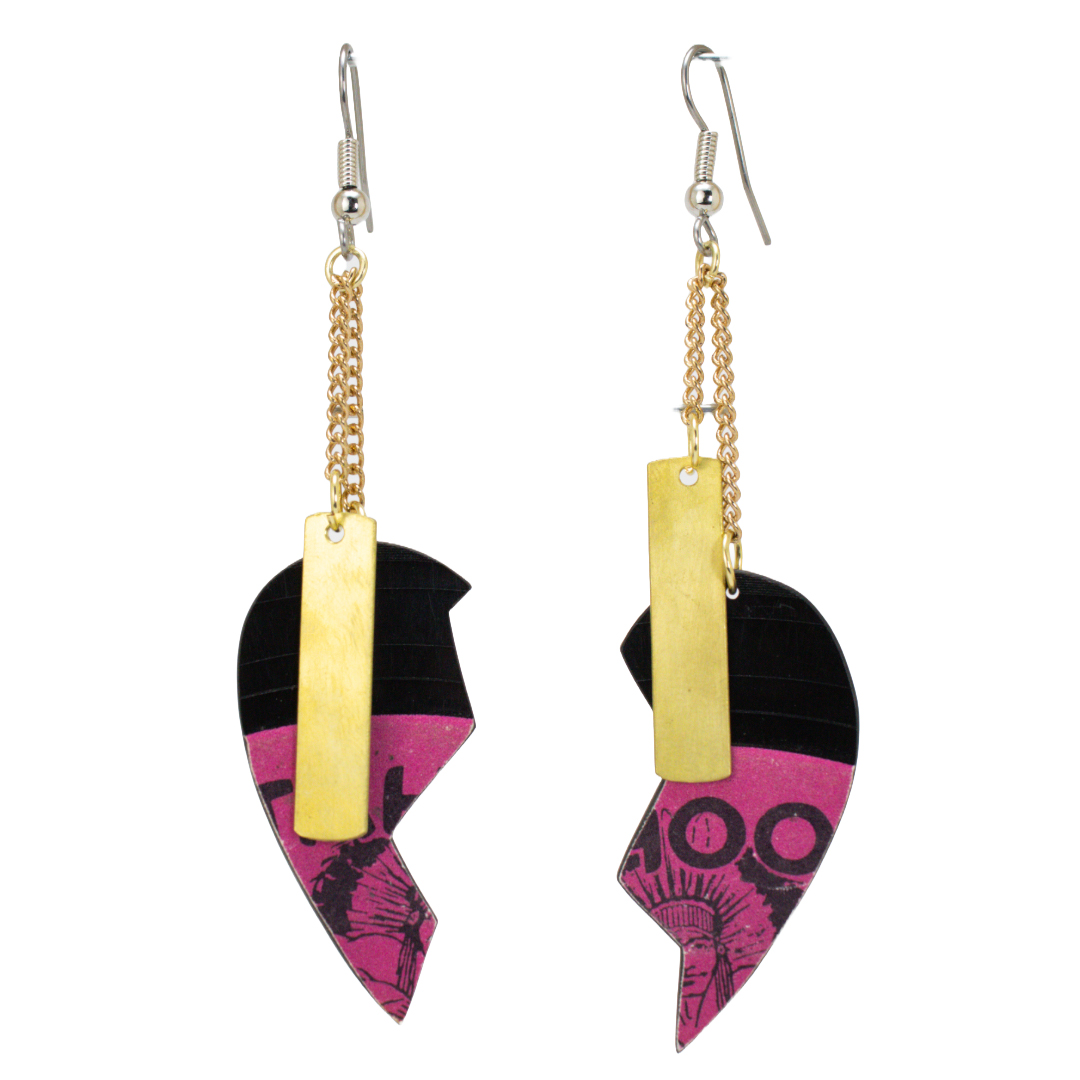 Hand-cut and hand-filed from an authentic The Murmaids 45 rpm single, these movable broken heart dangles bring rescued vinyl to life as a wearable piece of music history.