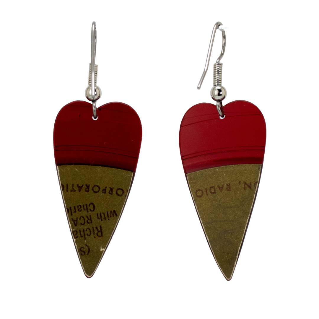Each Small Sleek Heart Classic Dangle is hand-cut and hand-filed from an authentic red vinyl RCA Victor Red Seal 45 featuring Richard Crooks, tenor. The sleek heart silhouette is delicate and precise — a slim, elegant form that suits the refinement of the music it came from. The rich red vinyl and gold RCA label make this piece as visually striking as it is historically rare, a quiet tribute to one of the great voices of the early recording era.