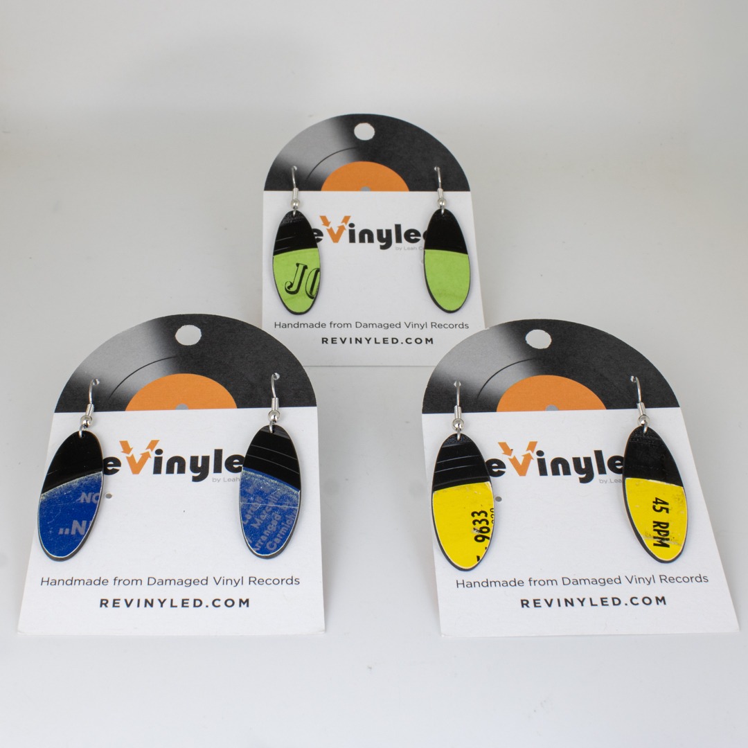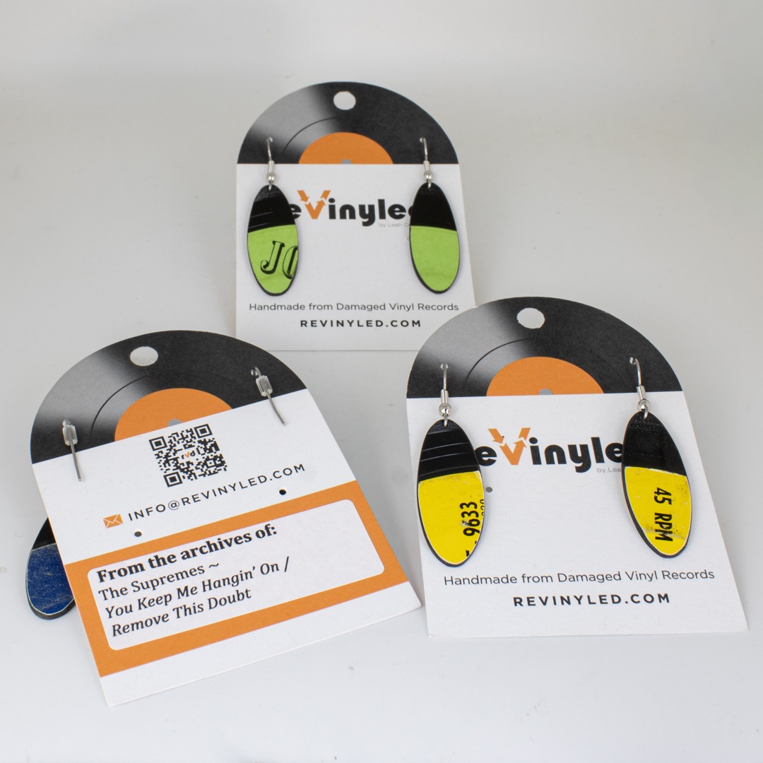 Each pair comes mounted on a reVinyled earring card, with the original album and artist identification noted on the back. Photos of the back of the card are included in the listing.