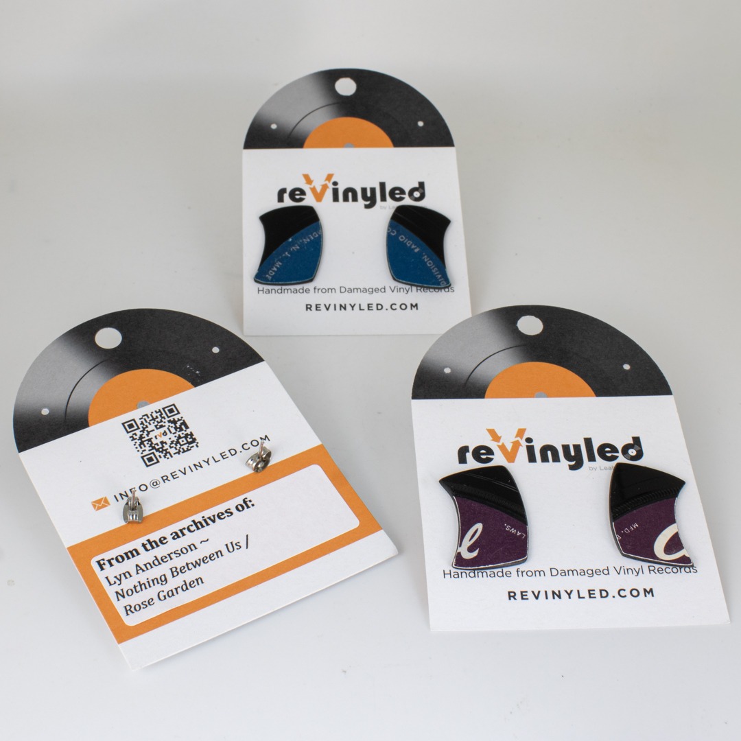 Each pair comes mounted on a reVinyled earring card, with the original album and artist identification noted on the back. Photos of the back of the card are included in the listing.