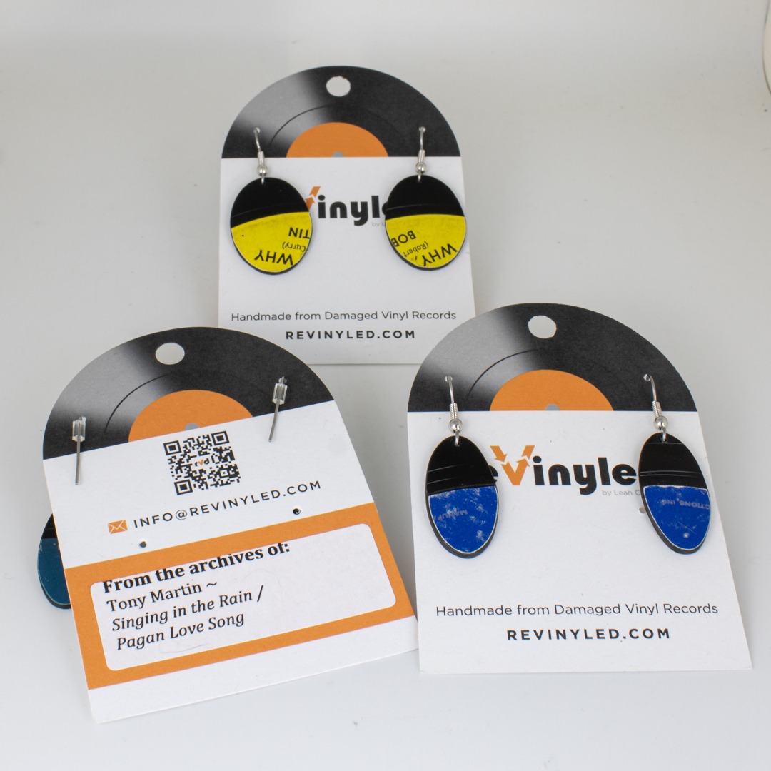 Each pair comes mounted on a reVinyled earring card, with the original album and artist identification noted on the back. Photos of the back of the card are included in the listing.
