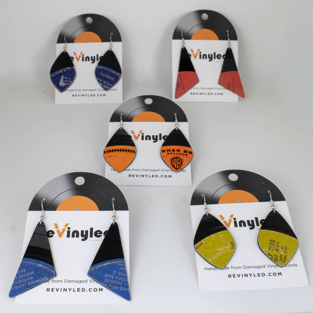 Each Wholesale Limited Edition bundle includes five individual pairs of handcrafted reVinyled earrings cut from authentic damaged vinyl records. This nan bundle is curated around our 5 color story, while preserving original label typography, graphics, and natural vintage wear.