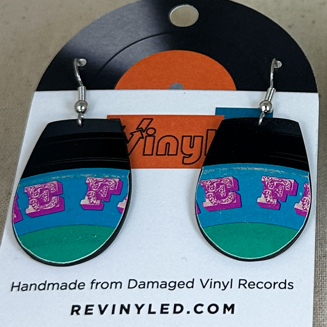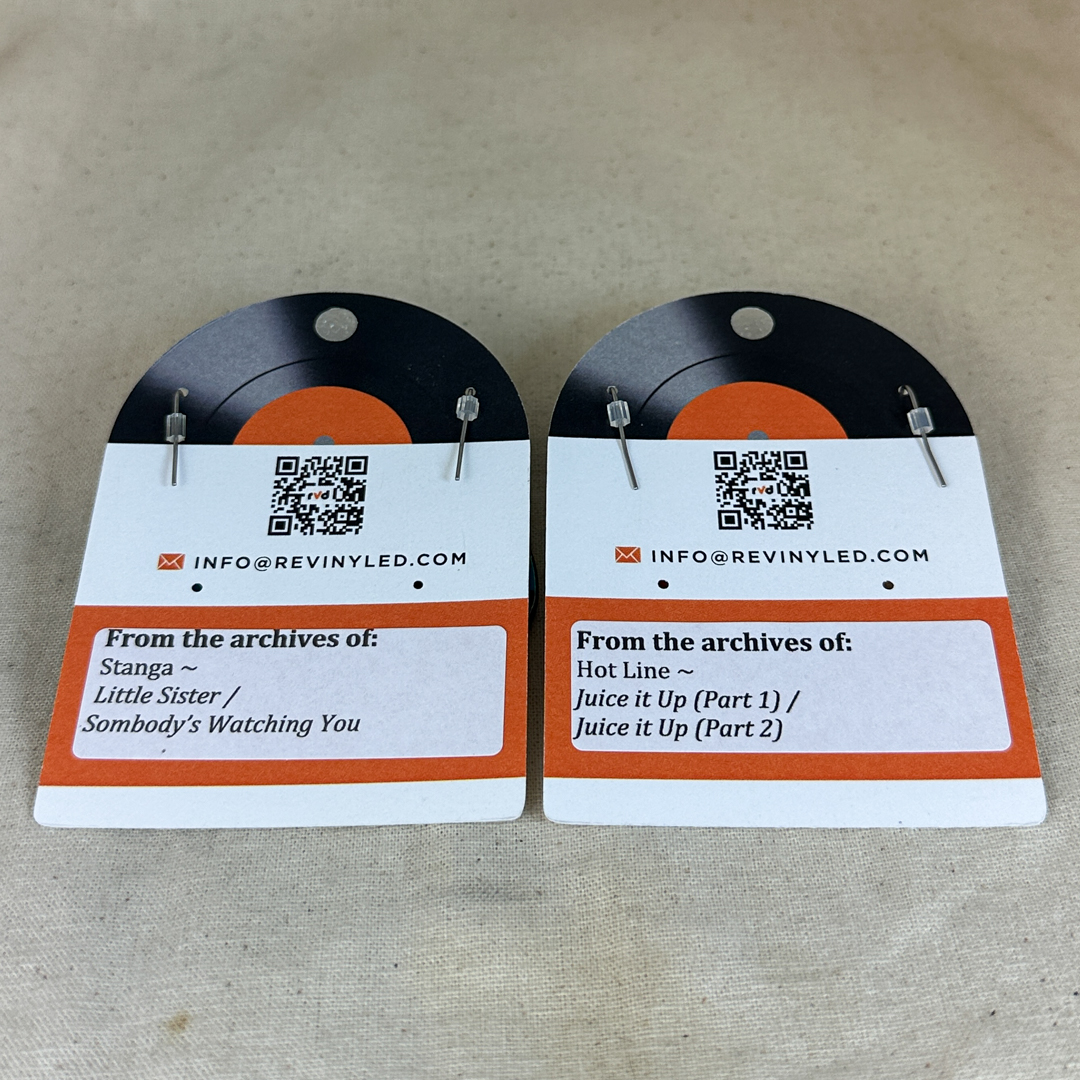 Each pair is hand-cut and hand-filed from authentic vintage vinyl records, preserving original label details and natural wear that make every bundle one of a kind. Hand-filed and finished in Philadelphia, this set is a wearable nod to seasonal change, easy movement, and feel-good sound.