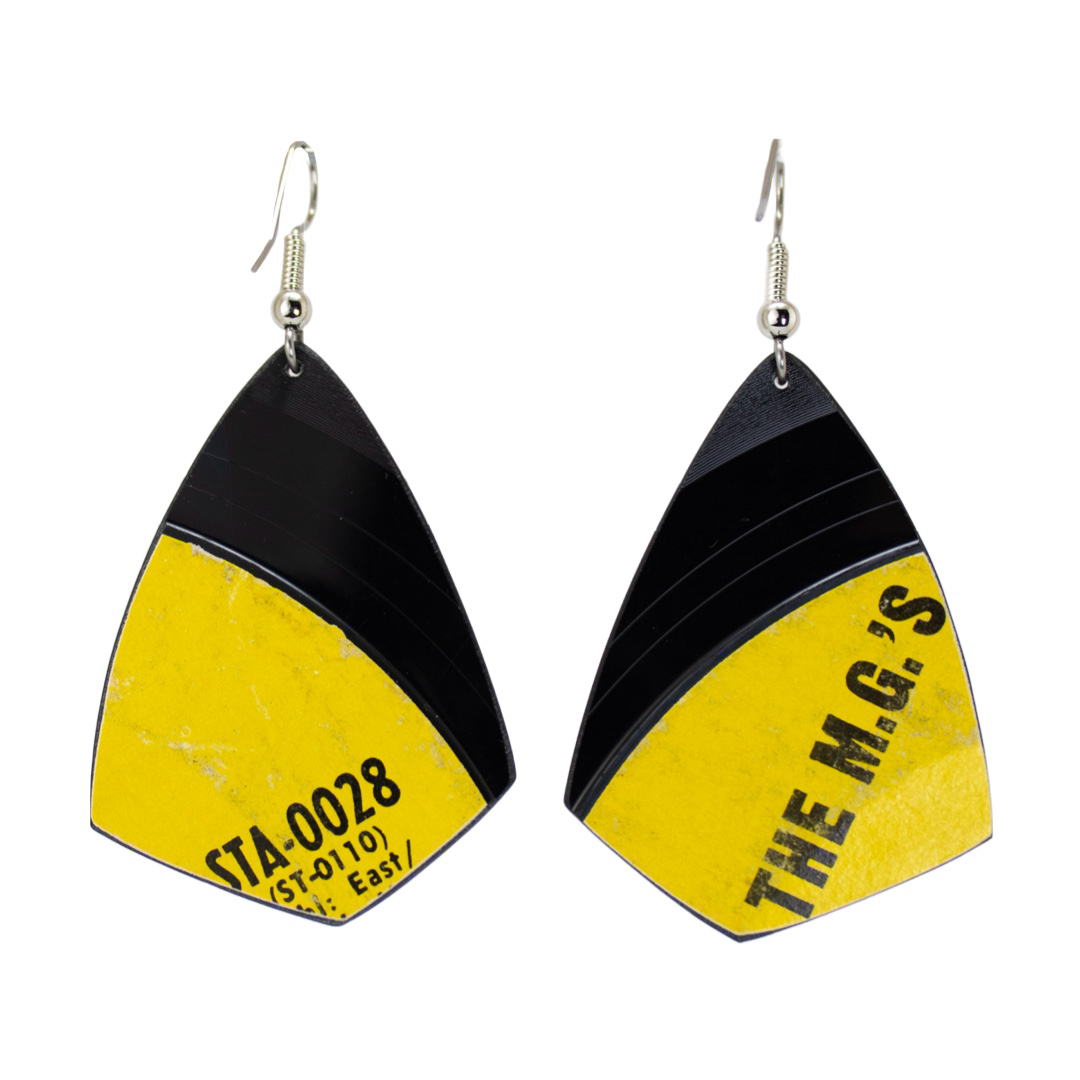 Get ready to rock out in style with these unique Upcycled Vinyl Record Earrings featuring a damaged 45 rpm record from Booker T and the M.G.'s on the iconic Stax Record label.