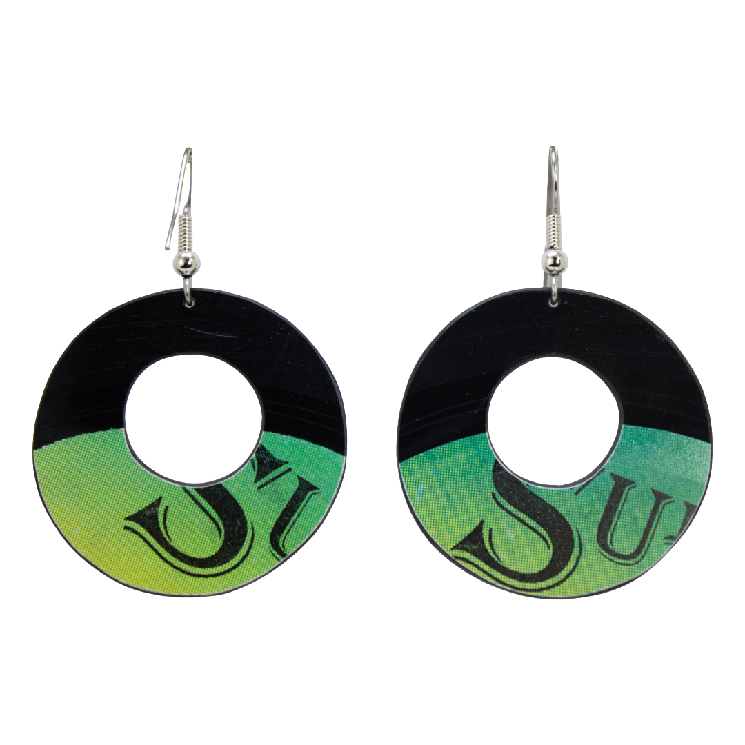 Where rhythm meets design. Each Round Dangle from the Center Hole Dangle Collection is hand-cut from authentic records and features the distinct center label that once spun beneath a turntable needle. These earrings celebrate the songs that defined eras and the craft that keeps them alive.