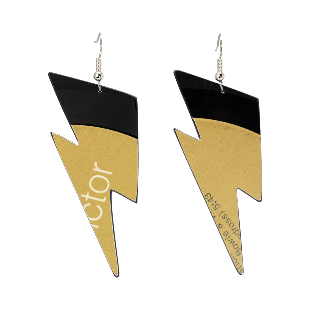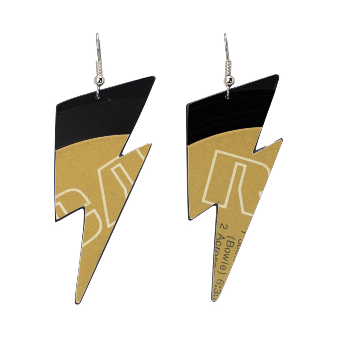 Introducing our funky and unique Upcycled Vinyl Record Earrings featuring the iconic David Bowie lightning bolt design! These medium bolt dangle earrings are a must-have for any Bowie fan or lover of statement jewelry. Handcrafted from his damaged ninth studio album, “Young Americans”, each pair is a one-of-a-kind piece that adds a touch of rock 'n' roll glam to any outfit.
