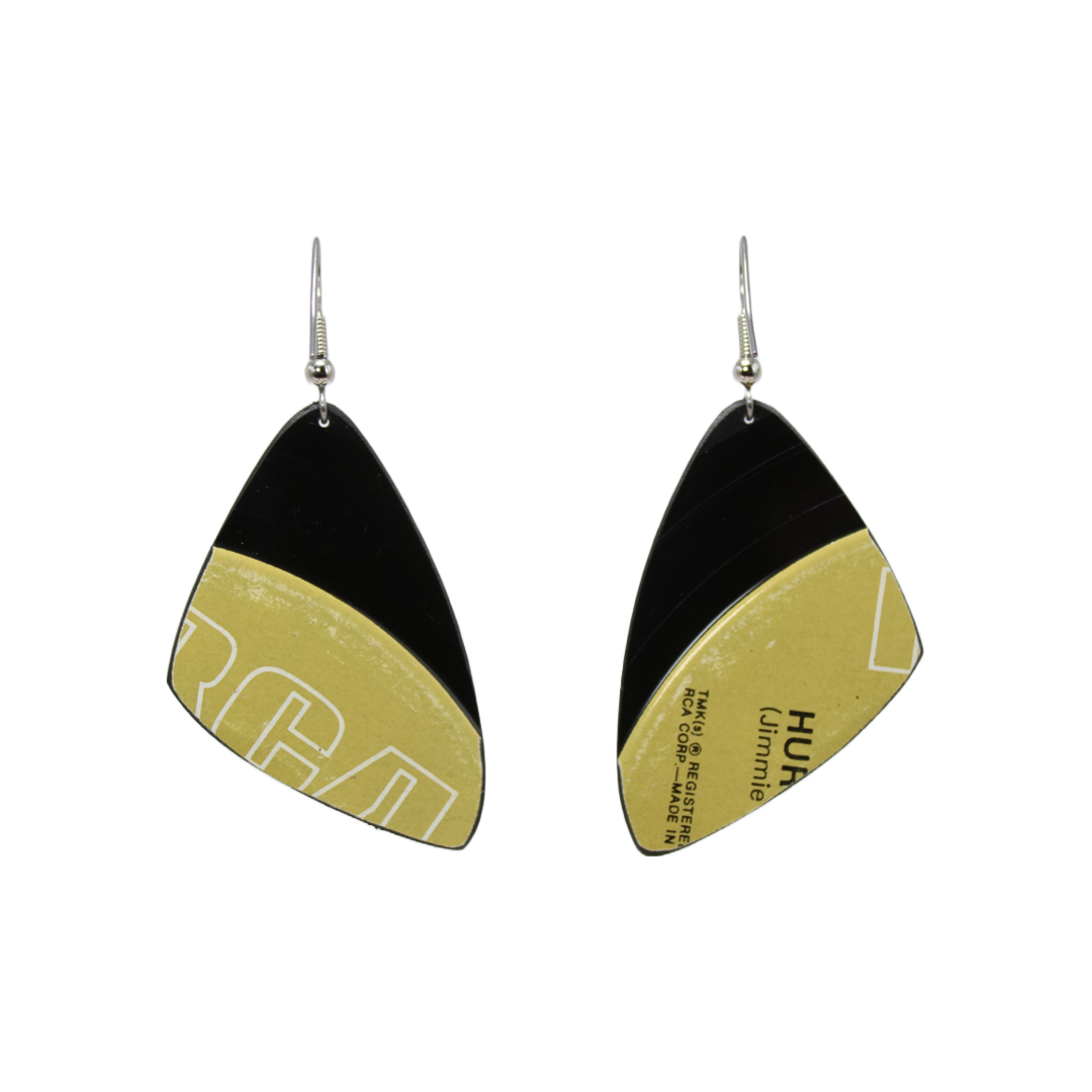 Each Small Wing Classic Dangle is hand-cut and hand-filed from an authentic 45 rpm pressing of “For the Heart” by Elvis Presley. The wing silhouette brings subtle movement and a sculptural feel, while the hand-finished vinyl preserves the character and history of the original record. Lightweight, expressive, and rooted in rock ’n’ roll legacy, these earrings turn a classic Elvis single into a modern, wearable keepsake.