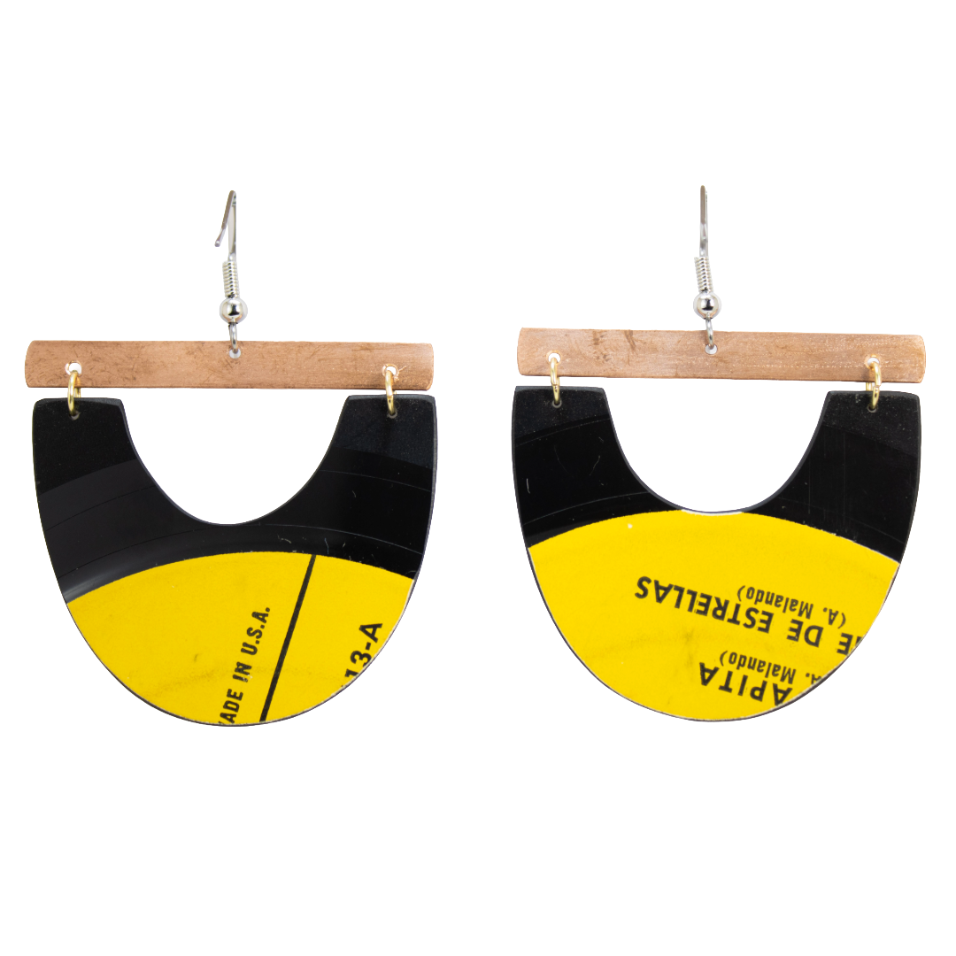 • Materials: Upcycled vinyl record, stainless-steel ear wire, copper