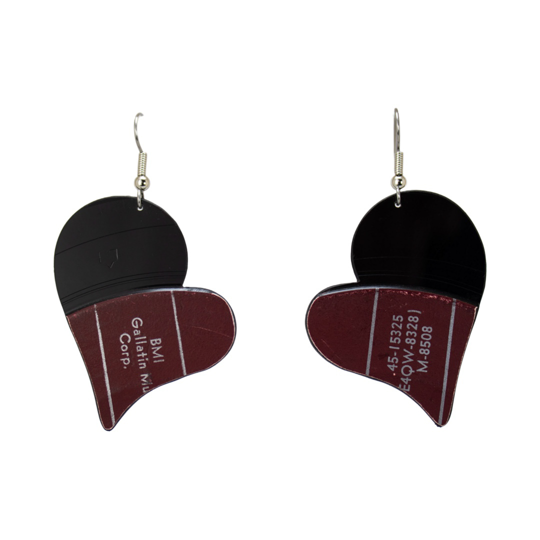 Handmade from damaged vinyl records, these heart dangle earrings are a must-have for music lovers and eco-conscious fashionistas alike.