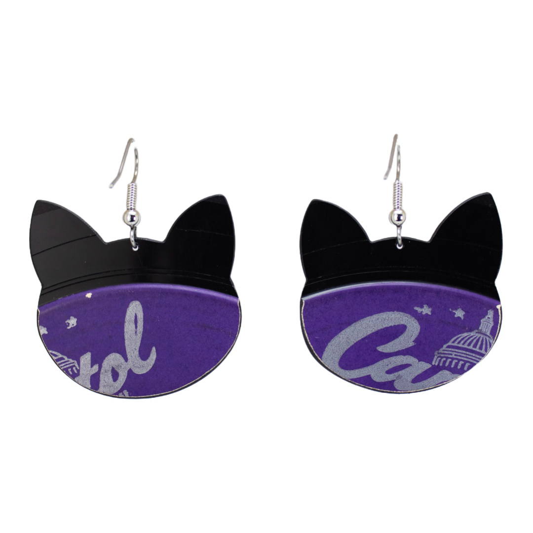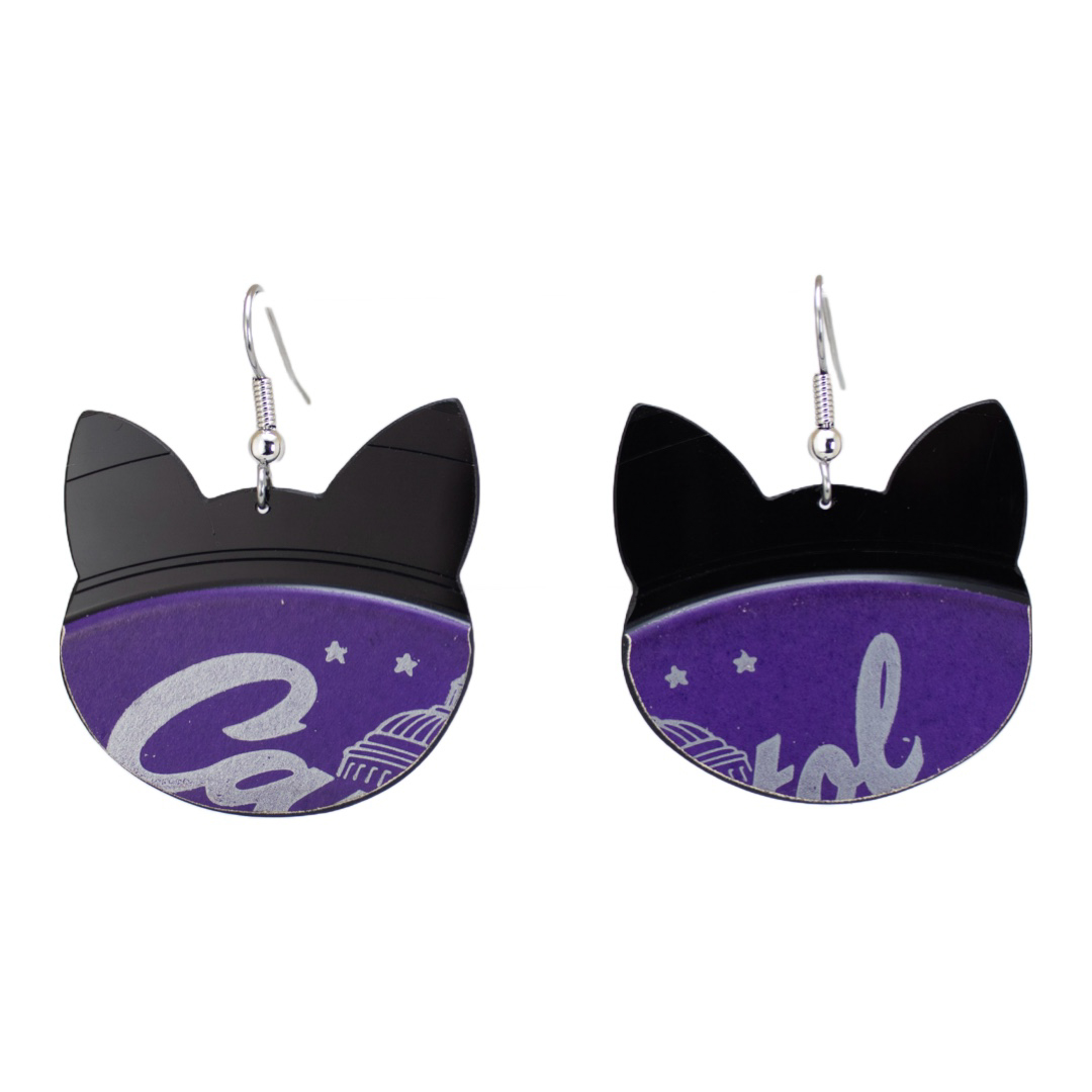 Handmade from upcycled vinyl records, these unique earrings feature a purrfectly designed cat head in purple and black.