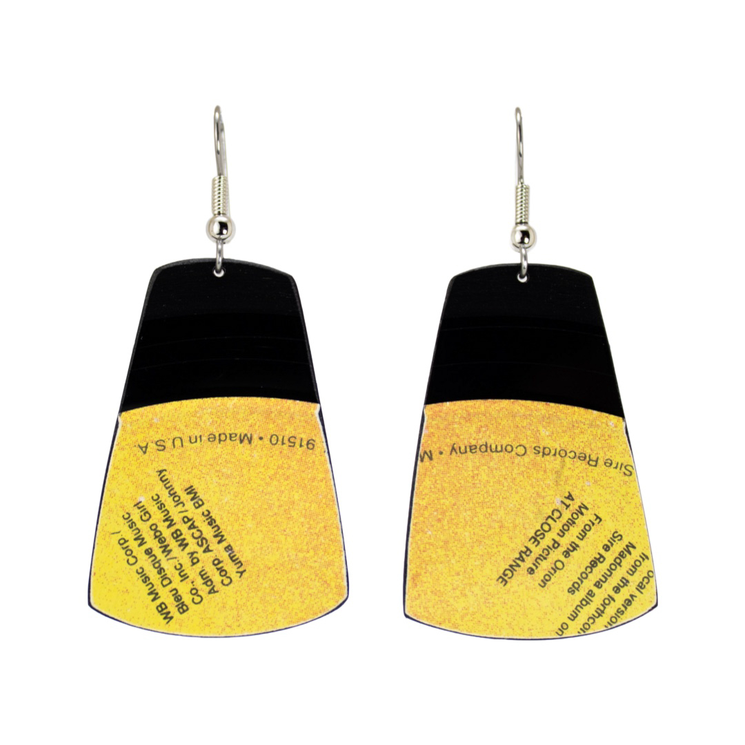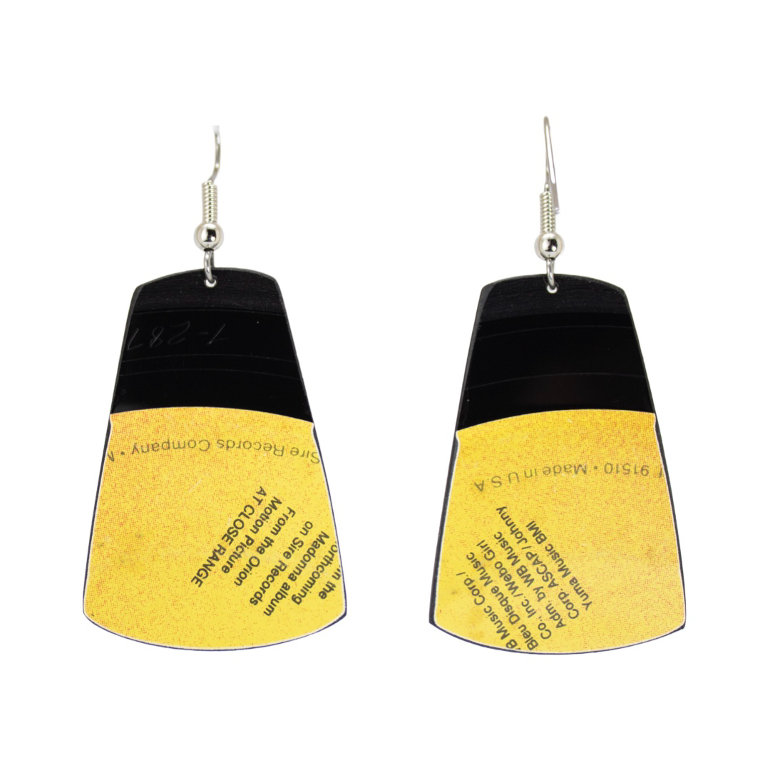 Each Medium Tapered Rectangle Classic Dangle is hand-cut and hand-filed from an authentic 45 rpm record featuring Madonna’s “Live To Tell.” The tapered rectangle silhouette adds movement and character while preserving the texture and history of the original vinyl. Lightweight yet visually striking, these earrings transform rescued music history into a wearable statement piece that feels both nostalgic and modern.