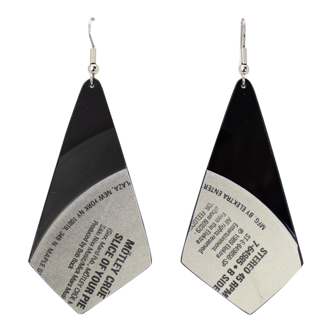 Rock out in style with these unique Upcycled Vinyl Record Earrings featuring a damaged 45 rpm single from the iconic Mötley Crüe single, "Slice of Your Pie".