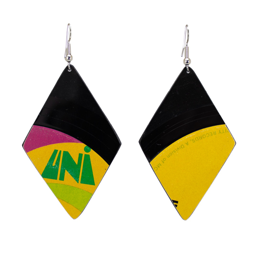 Get ready to rock out in style with these unique Upcycled Vinyl Record Earrings featuring the one and only Neil Diamond’s 45 rpm single “Holy Holy”. Handmade from damaged vinyl records, these medium diamond dangle earrings are perfect for any music lover looking to add a touch of vintage flair to their wardrobe. Stand out from the crowd with these eye-catching These medium diamond dangle earrings are handmade from upcycled Neil Diamond vinyl records. The unique black, yellow, and green design is perfect for any music lover.