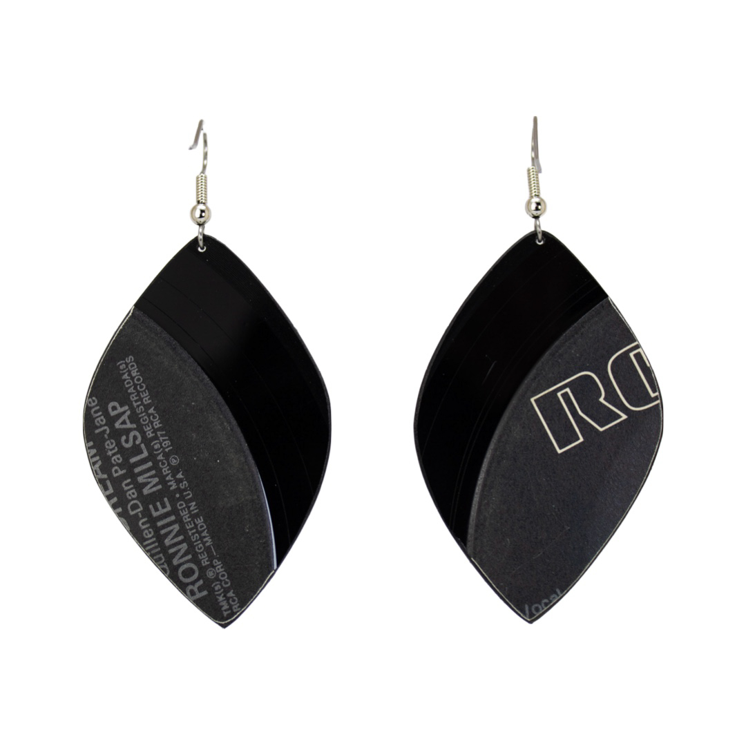 Add a touch of music history to your ensemble with these unique Upcycled Vinyl Record Earrings handmade from a Ronnie Milsap damaged 45rpm record featuring the iconic RCA records and the beloved "Nipper" the dog logo.