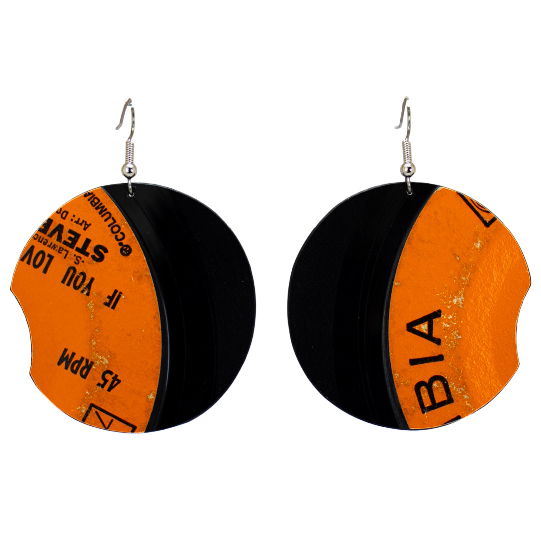 Handcrafted from his vintage, damaged 45 rpm records, these large round dangle earrings are sure to make a statement.