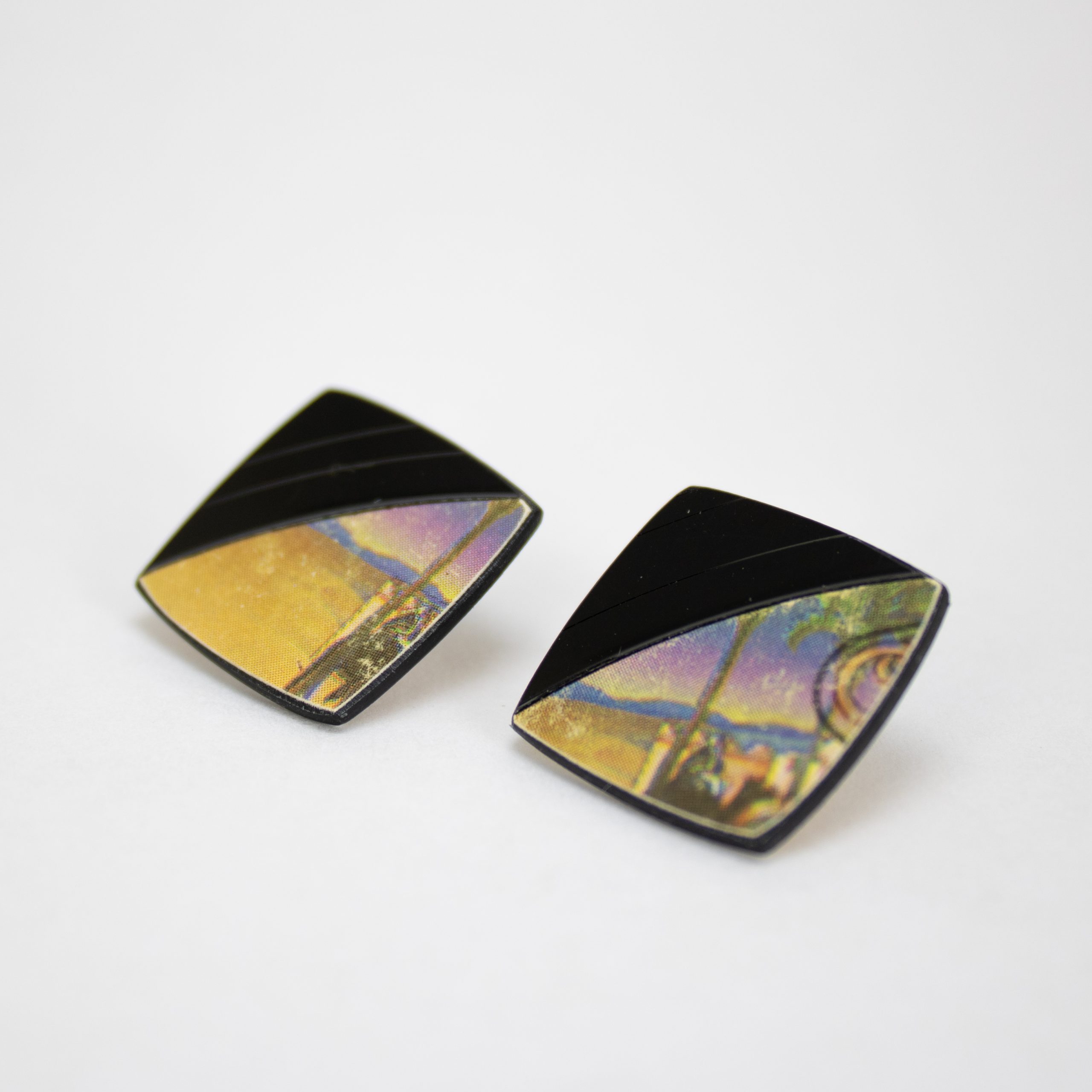 Add a touch of retro glamour to your outfit with these unique Upcycled Vinyl Record Earrings featuring The Four Tops damaged 45 rpm single “I Believe In You and me”! Handcrafted with love, these Small Button Square Stud earrings are perfect for music lovers and eco-conscious fashionistas alike. Stand out from the crowd with these one-of-a-kind statement pieces!