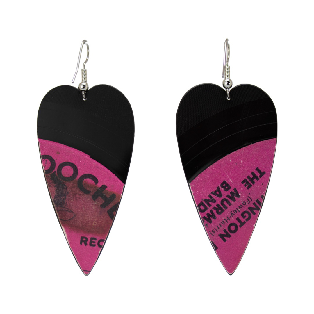 Upcycled Vinyl Record Earrings ~ The Murmaids ~ Large Sleek Heart Dangle