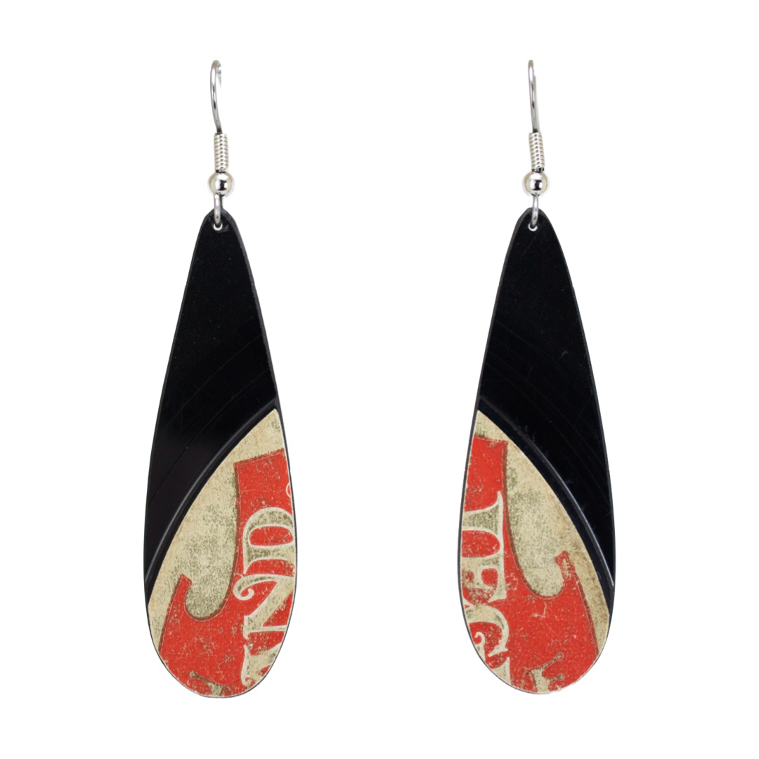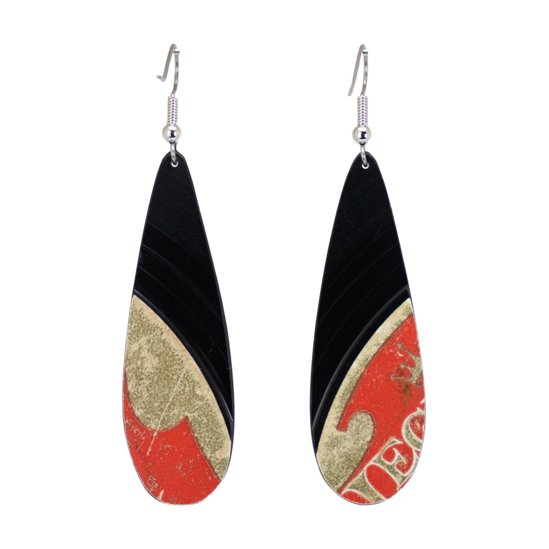 Each Medium Long Tear Classic Dangle is hand-cut and hand-filed from an authentic 45 rpm record featuring U.S. Bonds’s “Quarter to Three.” The long tear silhouette adds movement and character while preserving the texture and history of the original vinyl. Lightweight yet visually striking, these earrings transform rescued music history into a wearable statement piece that feels both nostalgic and modern.