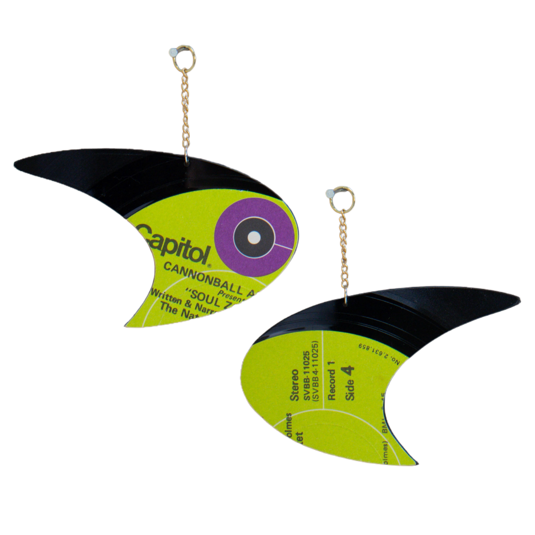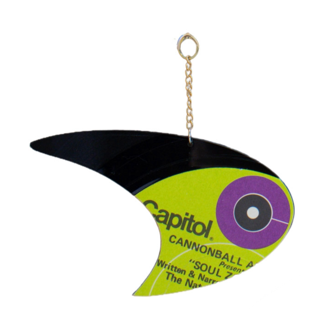 Each Orbit Astro ornament from the Atomic Collection is hand-cut and hand-filed from authentic vinyl once spinning on turntables of the Atomic Age. This piece features rescued vinyl from the Nat Adderley Sextet album Soul Zodiac, a psychedelic jazz-soul fusion project created in collaboration with Cannonball Adderley’s production team.