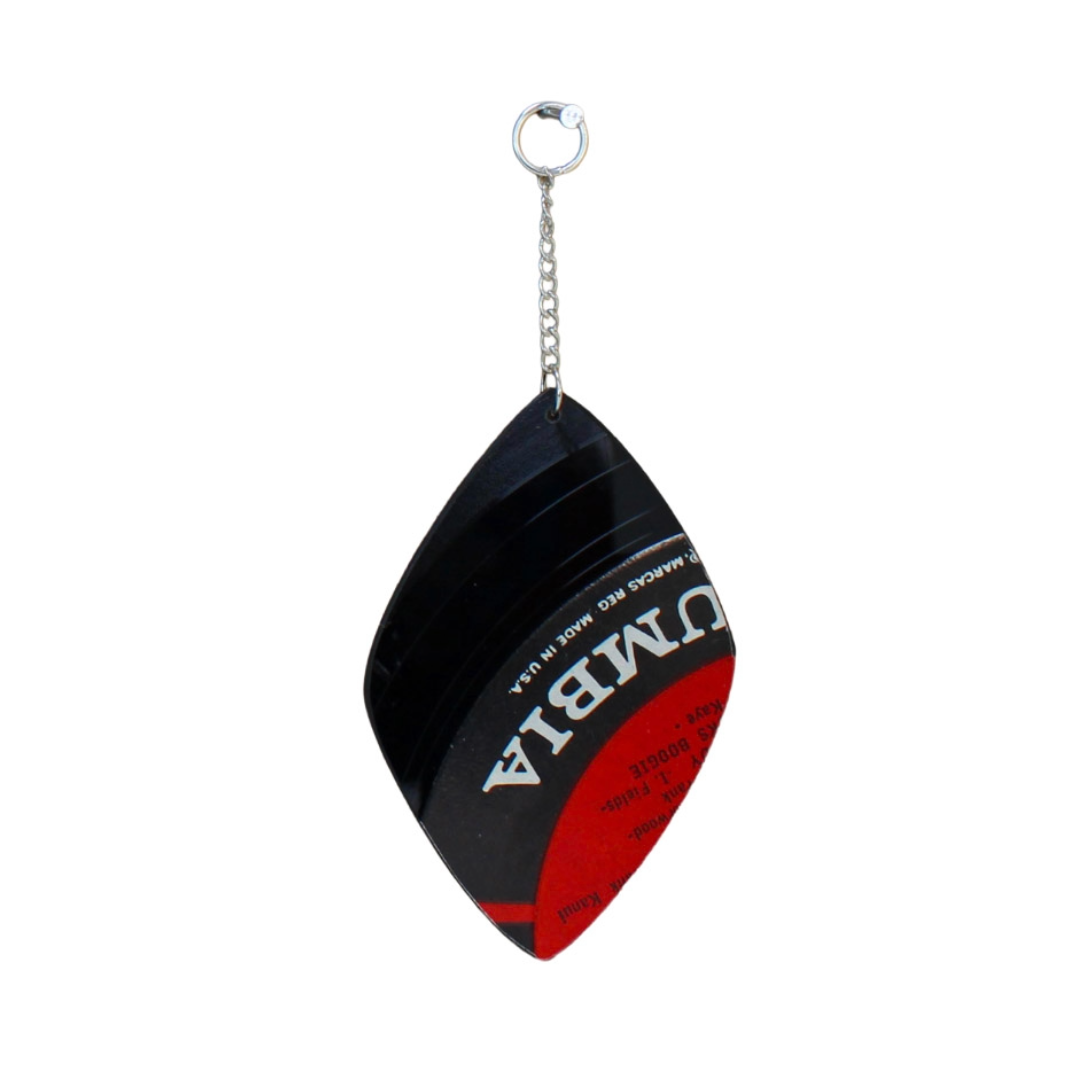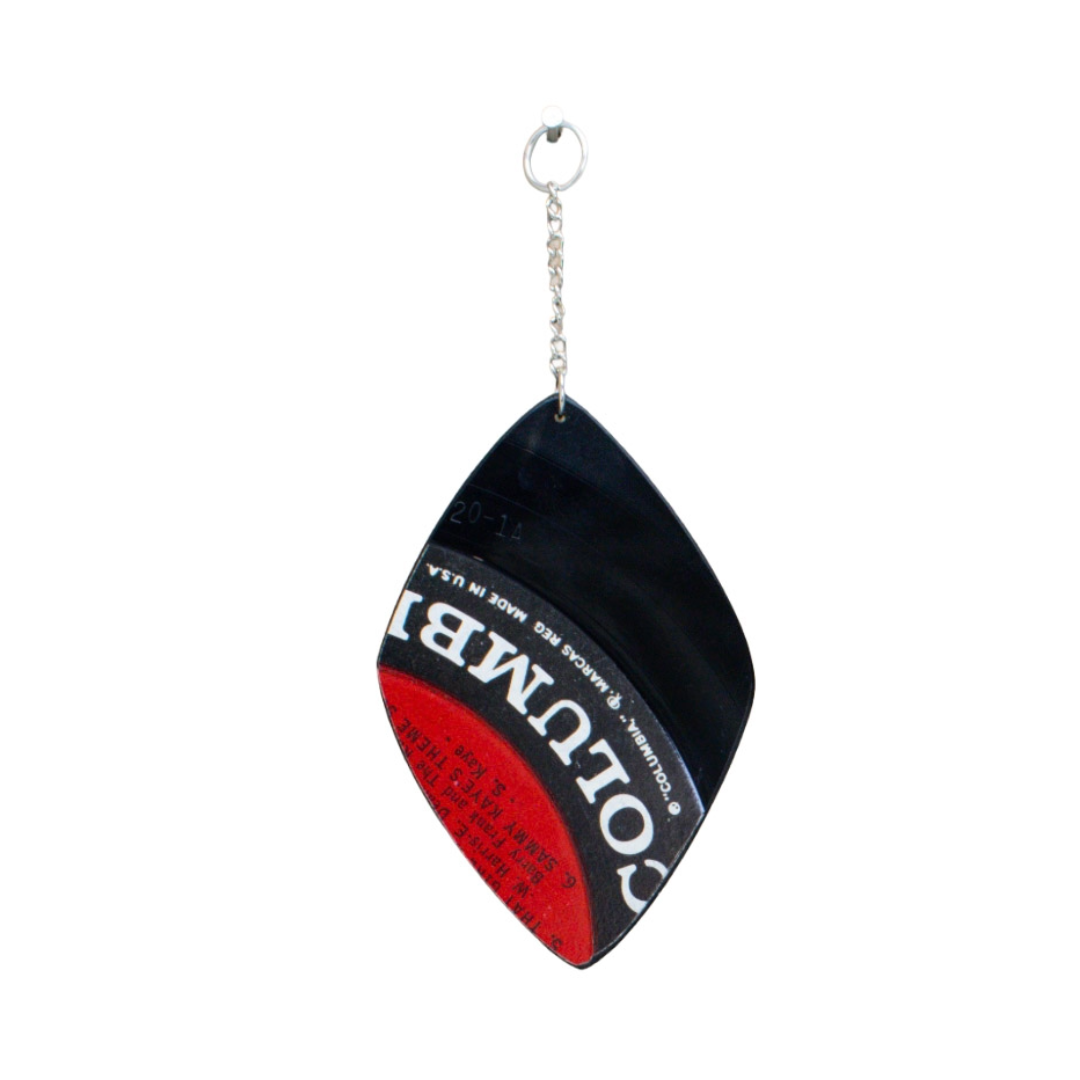 - Materials: Upcycled vinyl record, gold- or silver-colored base-metal chain, large metal ring for hanging