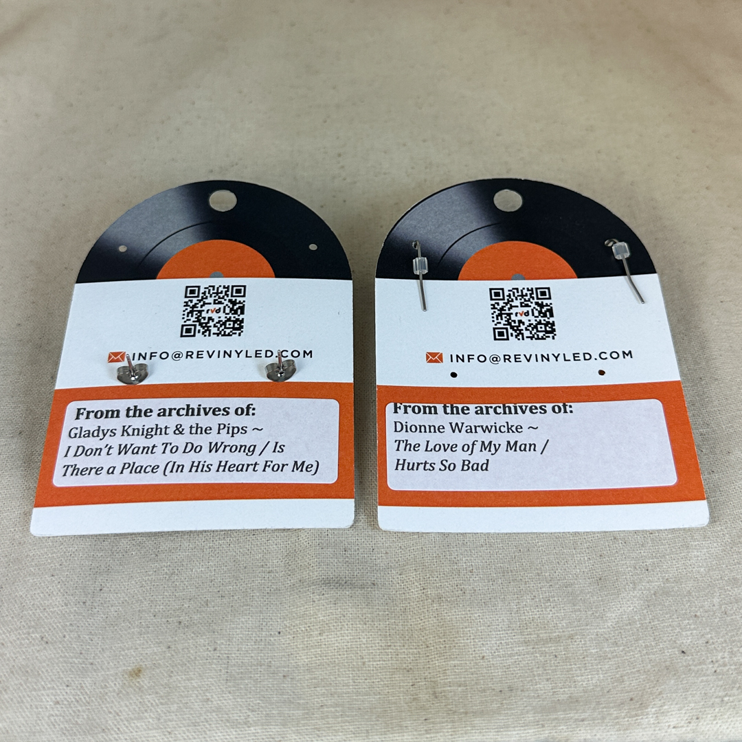 A refined two-pair bundle celebrating the elegance and emotional depth of classic soul, pairing Dionne Warwick and Gladys Knight & the Pips in fully shown, thoughtfully curated vinyl record earrings.